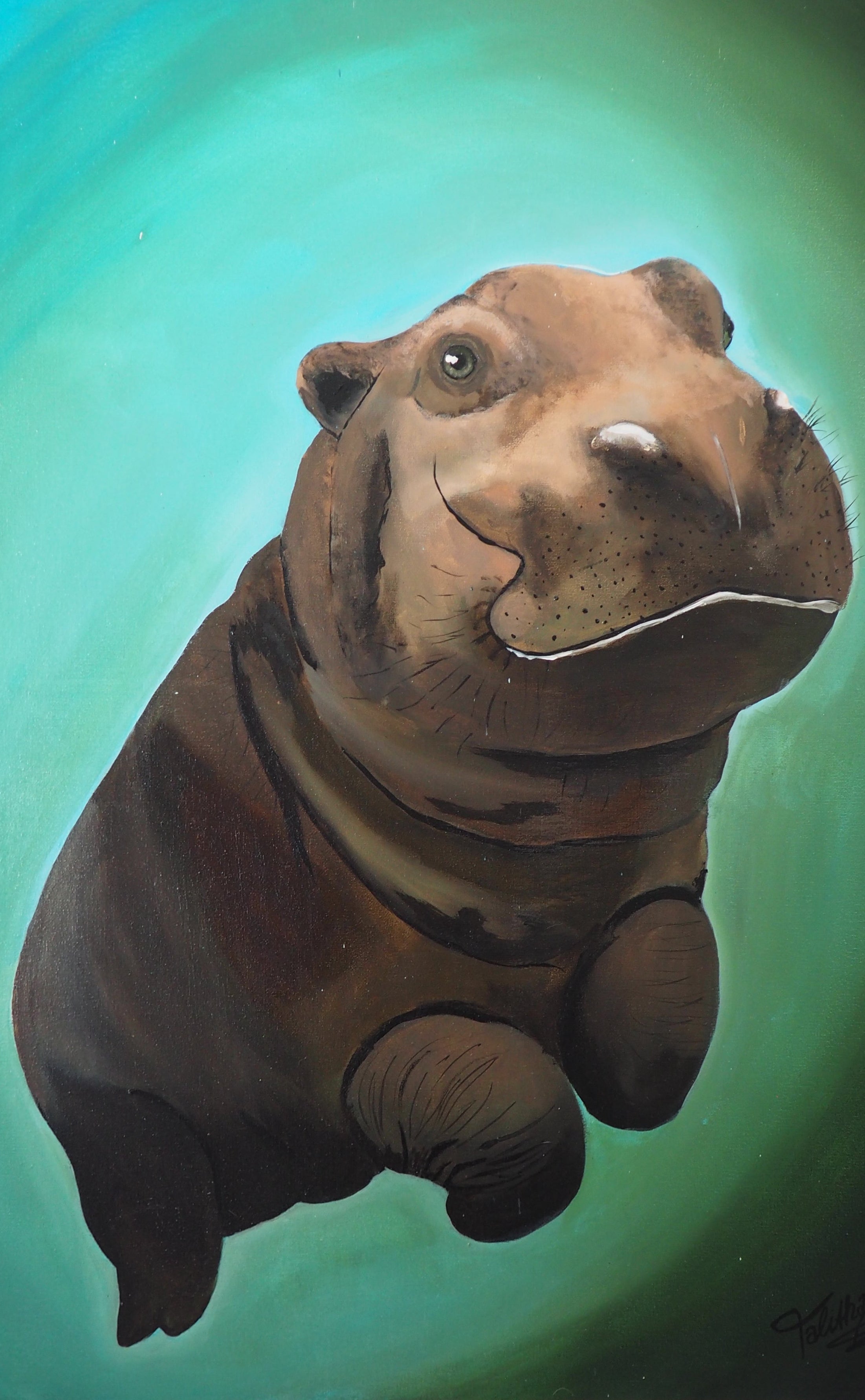 Das Bild löst bei mir Ruhe aus, es wirkt sympathisch. Das Hippo versüßt mir den Tag. Auch wenn ich 90 % vom Tag ziemlich ernst bin, finde ich die Parallelen zum Gemälde super. Wenn ich Personalgespräche führe, die Mitarbeiter schauen das Hippo an & es macht die Stimmung lockerer. Talitha ist unkompliziert, locker, zuverlässig & hat Talent.